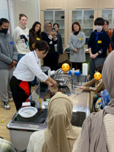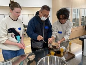 茶室についてのお話もあり、畳や生け花があることなどを学びました。抹茶の混ぜ方は、動画を見ながら「M」や「I」の動きで混ぜた後、ひらがなの「の」の形で終わることを教えていただきました。