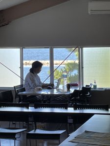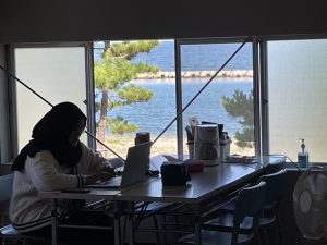 組合スタッフが、海を眺めつつ、心地よい風に吹かれて仕事をしていました。入国後講習中には味わえない、海の見える窓際ワークスペースは、期間限定・早い者勝ちの特等席!
